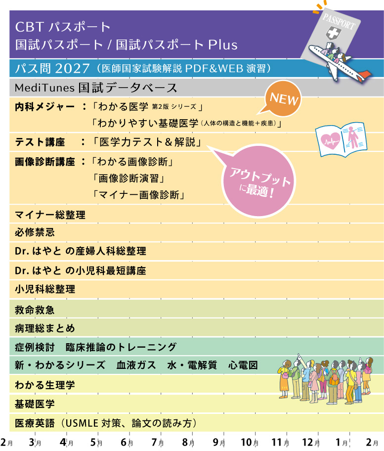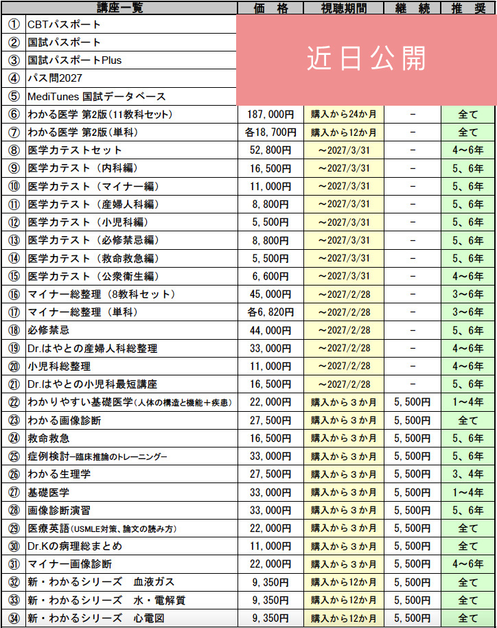 内科メジャー科目、マイナー科目、必修科目、産婦、小児、救急、テスト講座、全て2月から配信します。